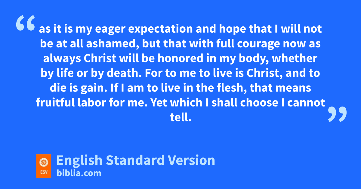 Yes, and I will rejoice, 19 for I know that fthrough your prayers and gthe help of hthe Spirit of Jesus Christ this will turn out for my deliverance, 20 as it is my eager expectation and hope ithat I will not be at all ashamed, but that with full jcourage now as always Christ kwill be honored in my body, lwhether by life or by death. 21 For to me mto live is Christ, and to die is gain. 22 If I am to live in the flesh, that means fruitful labor for me. Yet which I shall choose I cannot tell. 23 nI am hard pressed between the two. My desire is oto depart and pbe with Christ, for that is far better. 24 But to remain in the flesh is more necessary on your account. 25 qConvinced of this, rI know that I will remain and continue with you all, for your sprogress and tjoy in the faith, 26 so that in me uyou may have ample cause to glory in Christ Jesus, because of my coming to you again.