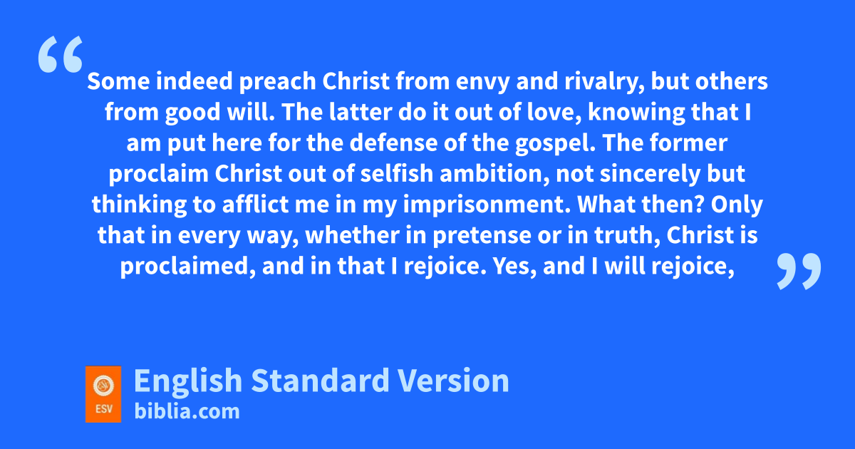 15 bSome indeed preach Christ from envy and rivalry, but others from good will. 16 The latter do it out of love, cknowing that I am put here for dthe defense of the gospel. 17 The former proclaim Christ eout of selfish ambition, not sincerely but thinking to afflict me in my imprisonment. 18 What then? Only that in every way, whether in pretense or in truth, Christ is proclaimed, and in that I rejoice.