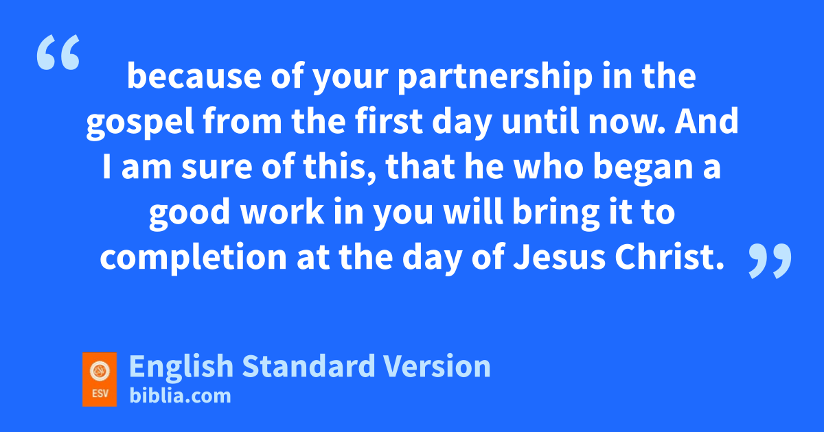 3 eI thank my God fin all my remembrance of you, 4 always in every prayer of mine for you all making my prayer with joy, 5 gbecause of your partnership in the gospel from the first day until now. 6 And I am sure of this, that he who began ha good work in you iwill bring it to completion at jthe day of Jesus Christ. 7 It is right for me to feel this way about you all, because I hold you kin my heart, for you are all lpartakers with me of grace,4 both min my imprisonment and in nthe defense and confirmation of the gospel. 8 For oGod is my witness, phow I yearn for you all with the affection of Christ Jesus. 9 And it is my prayer that qyour love may abound more and more, rwith knowledge and all discernment, 10 so that you may approve what is excellent, sand so be pure and blameless tfor the day of Christ, 11 filled uwith the fruit of righteousness that comes vthrough Jesus Christ, wto the glory and praise of God.