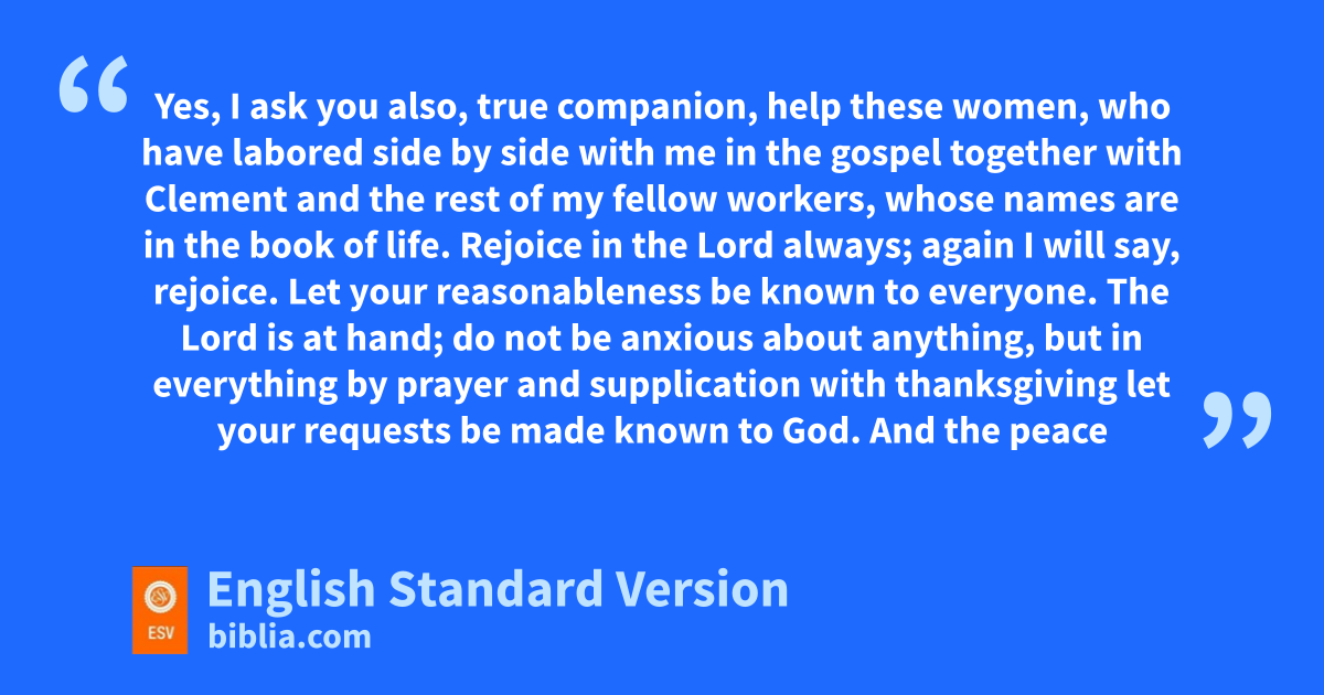 4 pRejoice in the Lord always; again I will say, rejoice. 5 Let your reasonableness4 be known to everyone. qThe Lord is at hand; 6 rdo not be anxious about anything, sbut in everything by prayer and supplication twith thanksgiving let your requests be made known to God. 7 And uthe peace of God, vwhich surpasses all understanding, will guard your hearts and your minds in Christ Jesus.