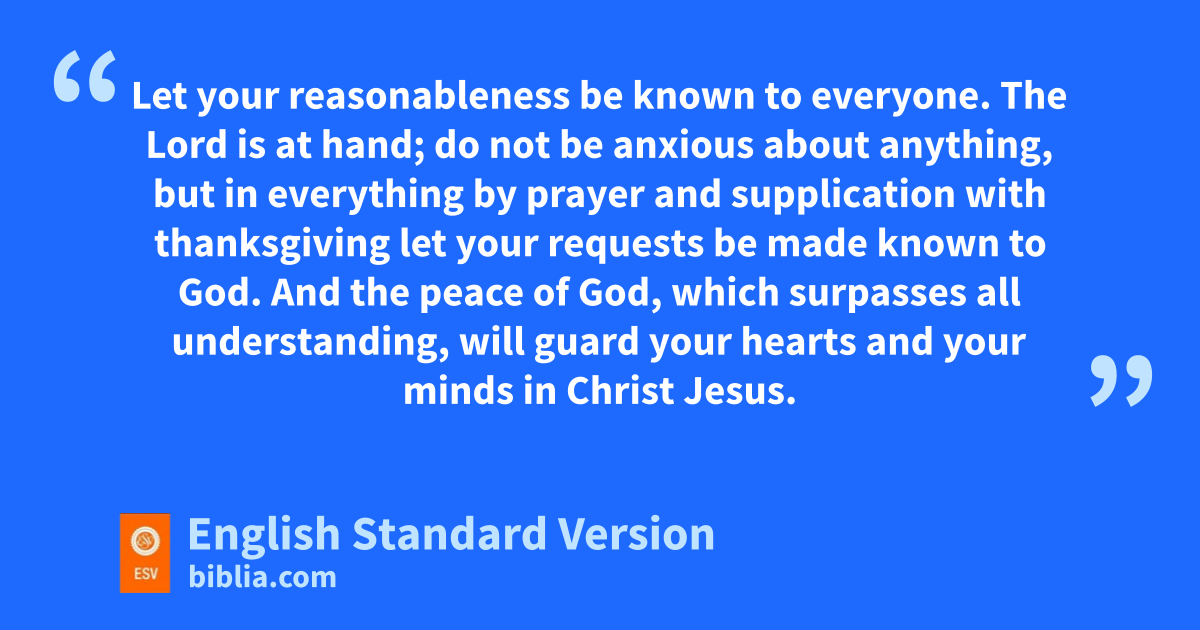 4 pRejoice in the Lord always; again I will say, rejoice. 5 Let your reasonableness4 be known to everyone. qThe Lord is at hand; 6 rdo not be anxious about anything, sbut in everything by prayer and supplication twith thanksgiving let your requests be made known to God. 7 And uthe peace of God, vwhich surpasses all understanding, will guard your hearts and your minds in Christ Jesus.