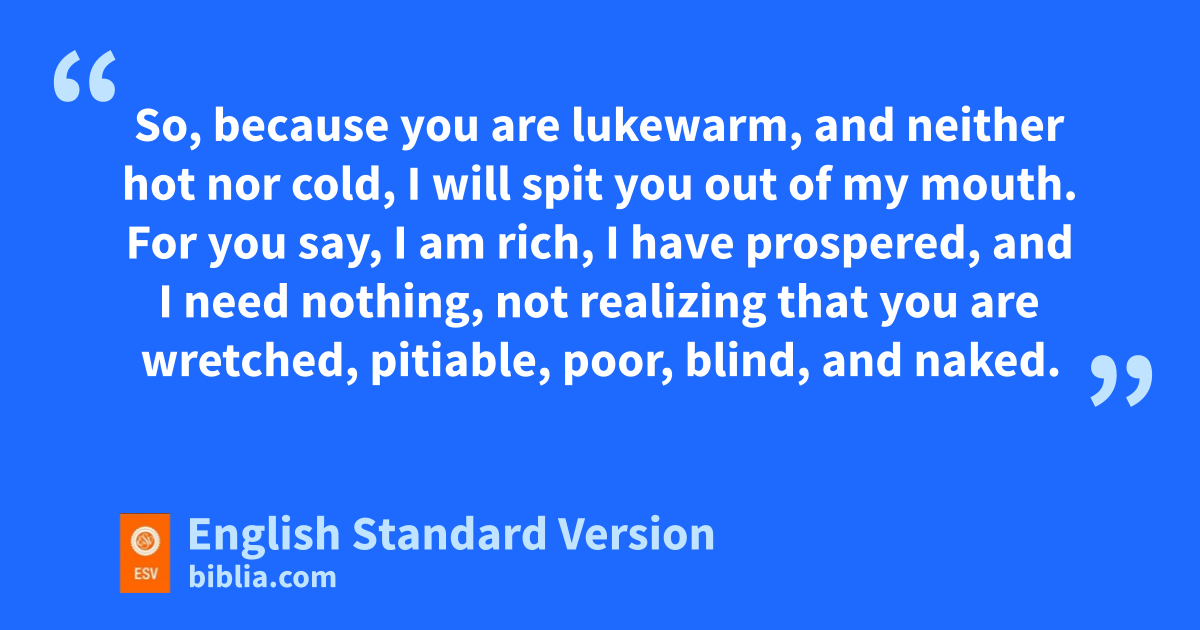 15 “ ‘I know your works: you are neither cold nor hot. sWould that you were either cold or hot! 16 So, because you are lukewarm, and neither hot nor cold, I will spit you out of my mouth. 17 tFor you say, I am rich, I have prospered, and I need nothing, not realizing that you are wretched, pitiable, poor, ublind, and naked. 18 I counsel you vto buy from me gold refined by fire, so that you may be rich, and wwhite garments so that you may clothe yourself and xthe shame of your nakedness may not be seen, and salve to anoint your eyes, uso that you may see. 19 yThose whom I love, I reprove and discipline, so be zealous and repent. 20 Behold, I stand at the door and zknock. aIf anyone hears my voice and opens the door, bI will come in to him and eat with him, and he with me. 21 cThe one who conquers, dI will grant him to sit with me on my throne, as eI also conquered and sat down with my Father on his throne. 22 pHe who has an ear, let him hear what the Spirit says to the churches.’ ”