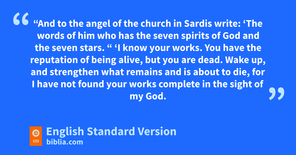 “ ‘I know your works. You have the reputation jof being alive, kbut you are dead. 2 Wake up, and strengthen what remains and is about to die, for I have not found your works lcomplete in the sight of my God. 3 mRemember, then, what you received and heard. Keep it, and repent. If you will not wake up, nI will come olike a thief, and you will not know at what hour I will come against you. 4 Yet you have still a few names in Sardis, people who have not psoiled their garments, and they will walk with me qin white, for they are rworthy. 5 sThe one who conquers will be clothed thus in white garments, and I will never tblot his name out of uthe book of life. vI will confess his name before my Father and before his angels. 6 pHe who has an ear, let him hear what the Spirit says to the churches.’