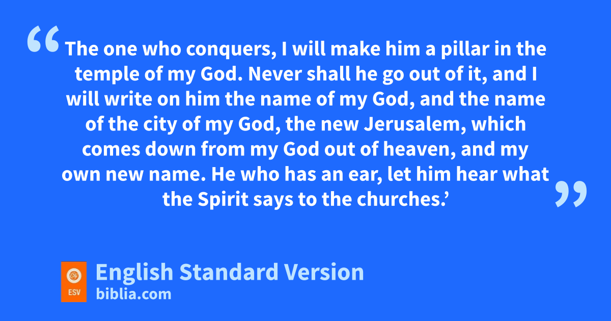 8 “ ‘I know your works. Behold, I have set before you aan open door, which no one is able to shut. I know that you have but little power, and yet you have kept my word and have not denied my name. 9 Behold, I will make those of bthe synagogue of Satan who say that they are Jews and are not, but lie—behold, cI will make them come and bow down before your feet, and they will learn that dI have loved you. 10 eBecause you have kept my word about patient endurance, I will keep you from the hour of trial that is coming on the whole world, to try fthose who dwell on the earth. 11 gI am coming soon. hHold fast what you have, so that no one may seize iyour crown. 12 jThe one who conquers, I will make him ka pillar in the temple of my God. Never shall he go out of it, and I will write on him lthe name of my God, and mthe name of the city of my God, mthe new Jerusalem, nwhich comes down from my God out of heaven, and my own onew name. 13 pHe who has an ear, let him hear what the Spirit says to the churches.’