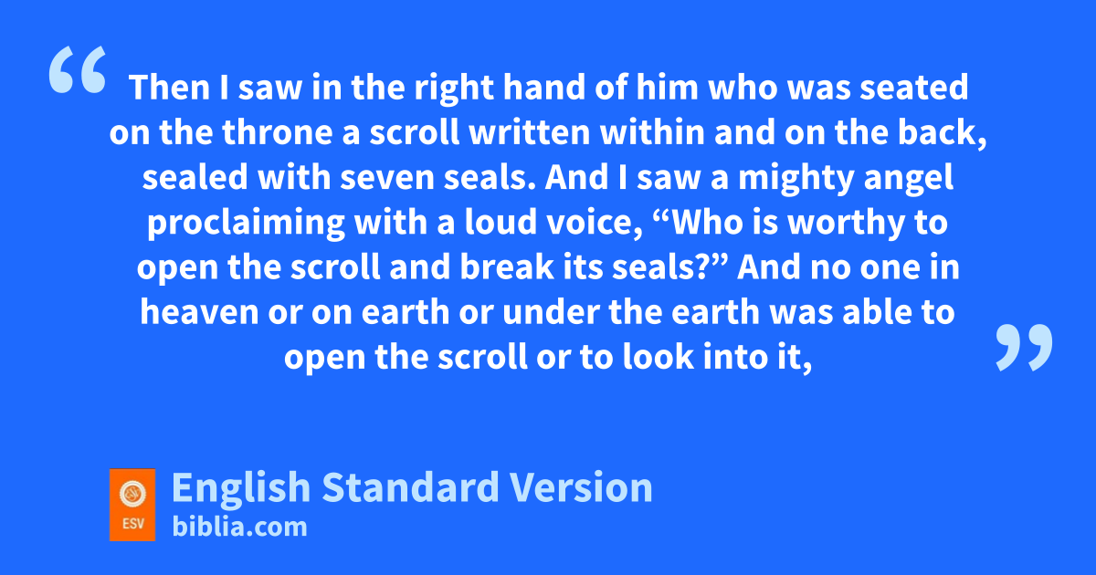 5 Then I saw in the right hand of him who was seated on the throne ha scroll written within and on the back, isealed with seven seals. 2 And jI saw a mighty angel proclaiming with a loud voice, “Who is worthy to open the scroll and break its seals?” 3 And no one in heaven or on earth or under the earth was able to open the scroll or to look into it, 4 and I began to weep loudly because no one was found worthy to open the scroll or to look into it. 5 And one of the elders said to me, “Weep no more; behold, kthe Lion lof the tribe of Judah, mthe Root of David, has conquered, so that he can open the scroll and its seven seals.”