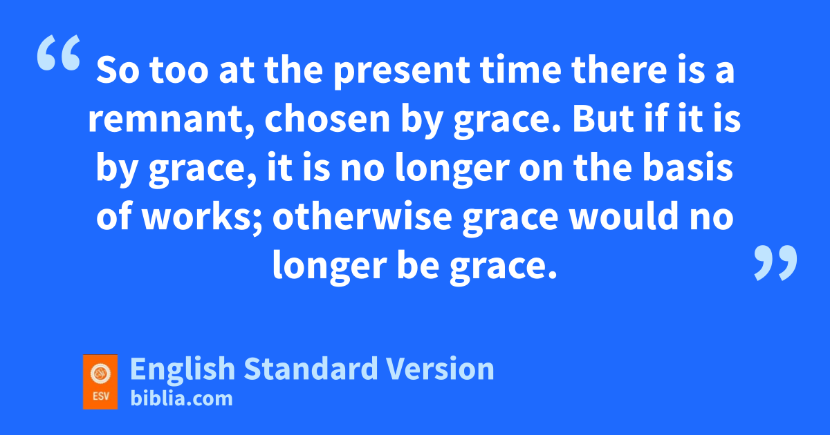 11 I ask, then, hhas God rejected his people? By no means! For iI myself am an Israelite, a descendant of Abraham,1 a member of the tribe of Benjamin. 2 jGod has not rejected his people whom he kforeknew. Do you not know what the Scripture says of Elijah, how he appeals to God against Israel? 3 l“Lord, they have killed your prophets, they have demolished your altars, and I alone am left, and they seek my life.” 4 But what is God’s reply to him? m“I have kept for myself seven thousand men who have not bowed the knee to Baal.” 5 So too at the present time there is na remnant, chosen by grace. 6 oBut if it is by grace, it is no longer on the basis of works; otherwise grace would no longer be grace.
