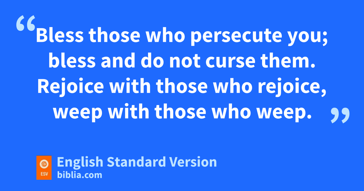 14 eBless those who persecute you; bless and do not curse them. 15 fRejoice with those who rejoice, weep with those who weep. 16 gLive in harmony with one another. hDo not be haughty, but associate with the lowly.8 iNever be wise in your own sight. 17 jRepay no one evil for evil, but kgive thought to do what is honorable in the sight of all. 18 If possible, so far as it depends on you, llive peaceably with all. 19 Beloved, mnever avenge yourselves, but leave it9 to the wrath of God, for it is written, n“Vengeance is mine, I will repay, says the Lord.” 20 To the contrary, o“if your enemy is hungry, feed him; if he is thirsty, give him something to drink; for by so doing you will heap burning coals on his head.” 21 Do not be overcome by evil, but overcome evil with good.
