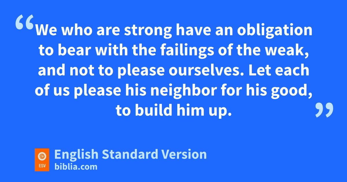 15 sWe who are strong thave an obligation to bear with the failings of the weak, and not to please ourselves. 2 uLet each of us please his neighbor for his good, to build him up. 3 For vChrist did not please himself, but as it is written, w“The reproaches of those who reproached you fell on me.” 4 For xwhatever was written in former days was written for our yinstruction, that through endurance and through zthe encouragement of the Scriptures we might have hope. 5 May the God of endurance and encouragement grant you ato live in such harmony with one another, in accord with Christ Jesus, 6 that together you may with one voice glorify bthe God and Father of our Lord Jesus Christ. 7 Therefore welcome one another as Christ has welcomed you, for the glory of God.