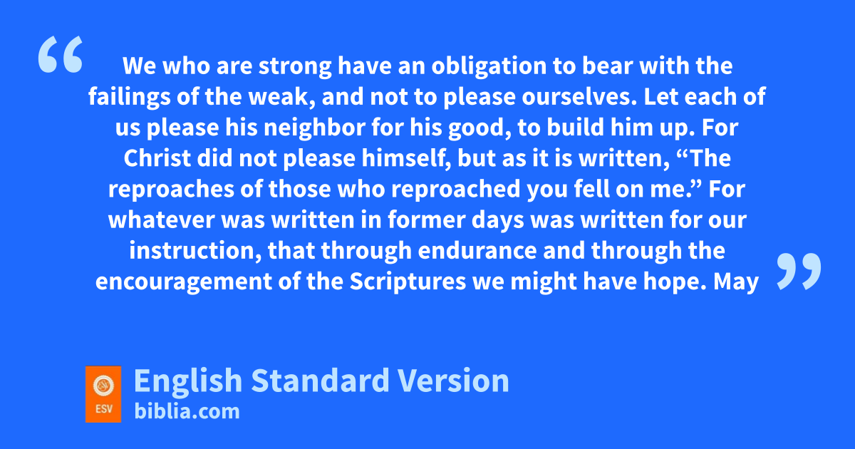 15 sWe who are strong thave an obligation to bear with the failings of the weak, and not to please ourselves. 2 uLet each of us please his neighbor for his good, to build him up. 3 For vChrist did not please himself, but as it is written, w“The reproaches of those who reproached you fell on me.” 4 For xwhatever was written in former days was written for our yinstruction, that through endurance and through zthe encouragement of the Scriptures we might have hope. 5 May the God of endurance and encouragement grant you ato live in such harmony with one another, in accord with Christ Jesus, 6 that together you may with one voice glorify bthe God and Father of our Lord Jesus Christ. 7 Therefore welcome one another as Christ has welcomed you, for the glory of God.