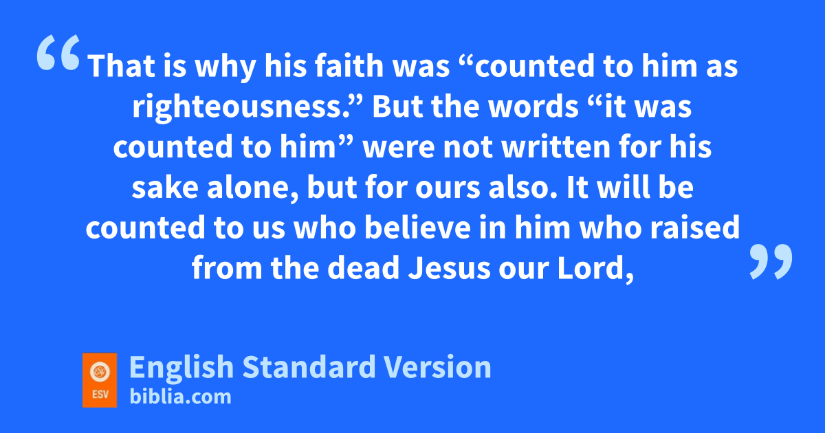 16 That is why it depends on faith, kin order that the promise may rest on grace and lbe guaranteed to all his offspring—not only to the adherent of the law but also to the one who shares the faith of Abraham, mwho is the father of us all, 17 as it is written, n“I have made you the father of many nations”—in the presence of the God in whom he believed, owho gives life to the dead and calls into existence pthe things that do not exist. 18 In hope he believed against hope, that he should become the father of many nations, as he had been told, q“So shall your offspring be.” 19 He did not weaken in faith when he considered his own body, which was ras good as dead (ssince he was about a hundred years old), or when he considered tthe barrenness3 of Sarah’s womb. 20 No unbelief made him waver concerning the promise of God, but he grew strong in his faith as he gave glory to God, 21 fully convinced that uGod was able to do what he had promised. 22 That is why his faith was “counted to him as righteousness.” 23 But vthe words “it was counted to him” were not written for his sake alone, 24 but for ours also. It will be counted to us wwho believe in xhim who raised from the dead Jesus our Lord, 25 ywho was delivered up for our trespasses and raised zfor our justification.