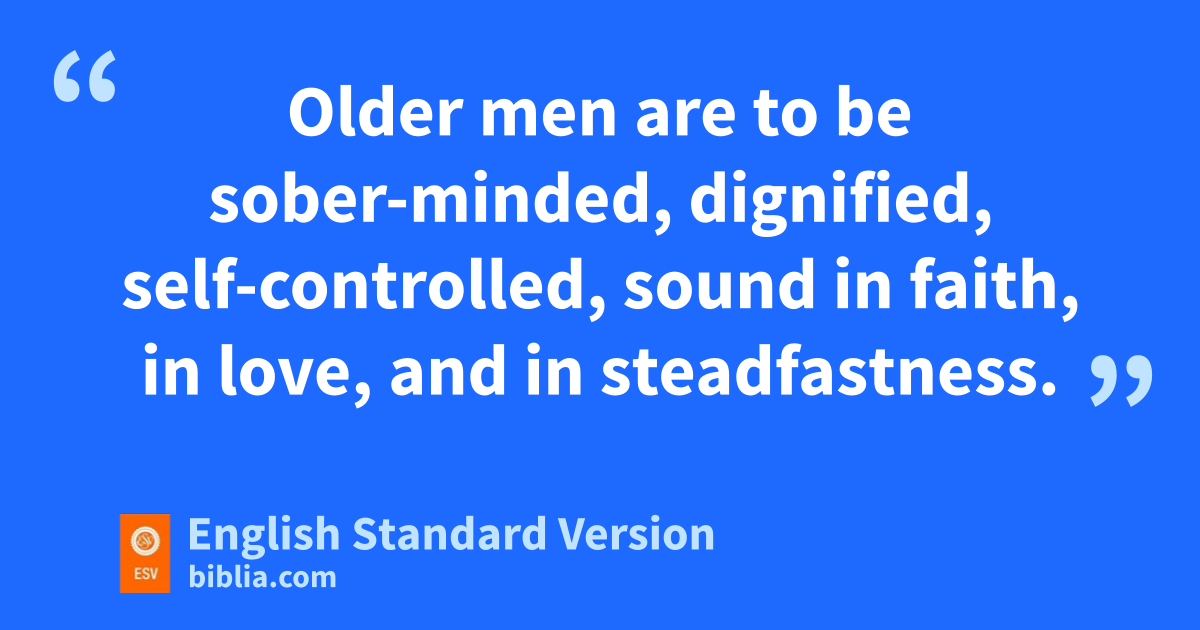 2 But as for you, teach what accords with psound1 doctrine. 2 Older men are to be sober-minded, dignified, self-controlled, psound in faith, in love, and in steadfastness. 3 qOlder women likewise are to be reverent in behavior, rnot slanderers sor slaves to much wine. They are to teach what is good, 4 and so train the young women to love their husbands and children, 5 to be self-controlled, tpure, uworking at home, kind, and vsubmissive to their own husbands, wthat the word of God may not be reviled. 6 Likewise, urge xthe younger men to be self-controlled. 7 Show yourself in all respects to be ya model of good works, and in your teaching zshow integrity, adignity, 8 and bsound speech that cannot be condemned, cso that an opponent may be put to shame, having nothing evil to say about us. 9 dBondservants2 are to be submissive to their own masters ein everything; they are to be well-pleasing, not argumentative, 10 not pilfering, fbut showing all good faith, gso that in everything they may adorn the doctrine of God our Savior.