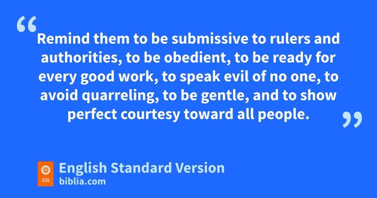 3 Remind them xto be submissive to rulers and authorities, yto be obedient, to be ready for every good work, 2 zto speak evil of no one, ato avoid quarreling, to be gentle, and bto show perfect courtesy toward all people. 3 For cwe ourselves were once foolish, disobedient, led astray, slaves to various passions and pleasures, passing our days in malice and envy, hated by others and hating one another. 4 But when dthe goodness and loving kindness of God our Savior appeared, 5 he saved us, enot because of works done by us in righteousness, but faccording to his own mercy, by gthe washing of regeneration and hrenewal of the Holy Spirit, 6 whom he ipoured out on us richly through Jesus Christ our Savior, 7 so that jbeing justified by his grace we might become kheirs laccording to the hope of eternal life. 8 The saying is mtrustworthy, and I want you to insist on these things, so that those who have believed in God may be careful nto devote themselves to good works. These things are excellent and profitable for people. 9 But oavoid foolish pcontroversies, qgenealogies, dissensions, and quarrels about the law, for rthey are unprofitable and worthless. 10 As for a person who stirs up division, safter warning him once and then twice, thave nothing more to do with him, 11 knowing that such a person is warped and sinful; he is self-condemned.