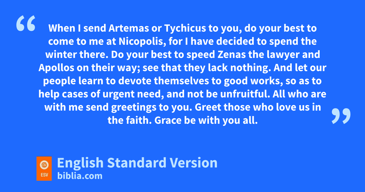 12 When I send Artemas or uTychicus to you, do your best to come to me vat Nicopolis, for I have decided to spend the winter there. 13 Do your best to speed Zenas the lawyer and wApollos on their way; see that they lack nothing. 14 And let our people learn xto devote themselves to good works, so as to help cases of urgent need, and not ybe unfruitful.