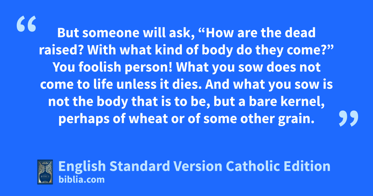 But someone will ask, “How are the dead raised? With what kind of body do they come?” You foolish person! What you sow does not come to life unless it dies. And what you sow is not the body that is to be, but a bare kernel, perhaps of wheat or of some other grain.