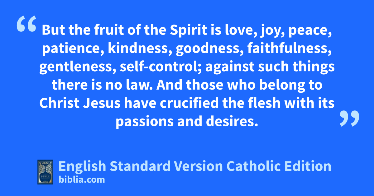 But the fruit of the Spirit is love, joy, peace, patience, kindness, goodness, faithfulness, gentleness, self-control; against such things there is no law. And those who belong to Christ Jesus have crucified the flesh with its passions and desires.