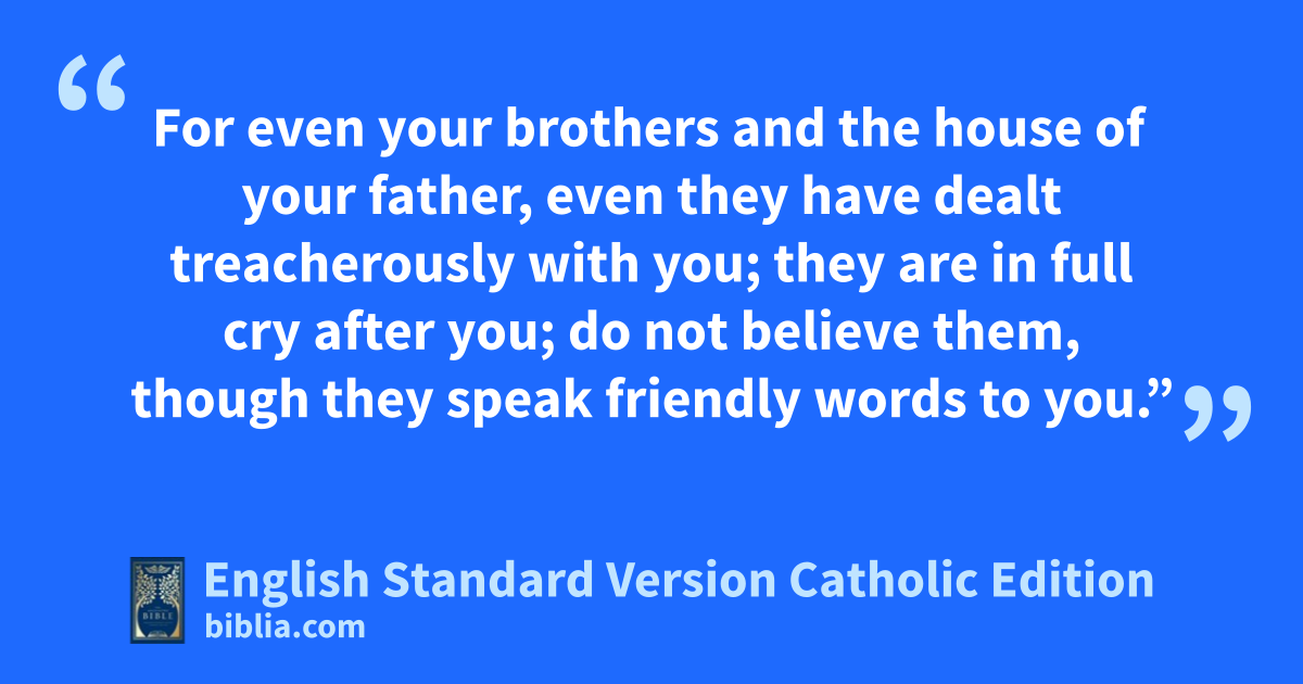 For even your brothers and the house of your father, even they have dealt treacherously with you; they are in full cry after you; do not believe them, though they speak friendly words to you.”