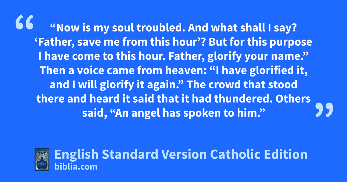“Now is my soul troubled. And what shall I say? ‘Father, save me from this hour’? But for this purpose I have come to this hour. Father, glorify your name.” Then a voice came from heaven: “I have glorified it, and I will glorify it again.” The crowd that stood there and heard it said that it had thundered. Others said, “An angel has spoken to him.”