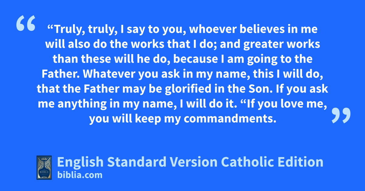 “Truly, truly, I say to you, whoever believes in me will also do the works that I do; and greater works than these will he do, because I am going to the Father. Whatever you ask in my name, this I will do, that the Father may be glorified in the Son. If you ask me anything in my name, I will do it. “If you love me, you will keep my commandments.