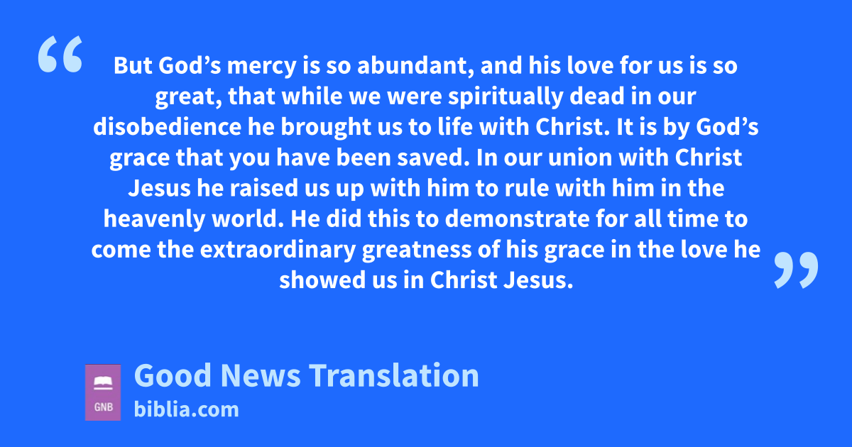 4 *But God’s mercy is so abundant, and his love for us is so great, 5*that while we were spiritually dead in our disobedience he brought us to life with Christ. It is by God’s grace that you have been saved. 6In our union with Christ Jesus he raised us up with him to rule with him in the heavenly world. 7He did this to demonstrate for all time to come the extraordinary greatness of his grace in the love he showed us in Christ Jesus. 8–9For it is by God’s grace that you have been saved through faith. It is not the result of your own efforts, but God’s gift, so that no one can boast about it. 10God has made us what we are, and in our union with Christ Jesus he has created us for a life of good deeds, which he has already prepared for us to do.
