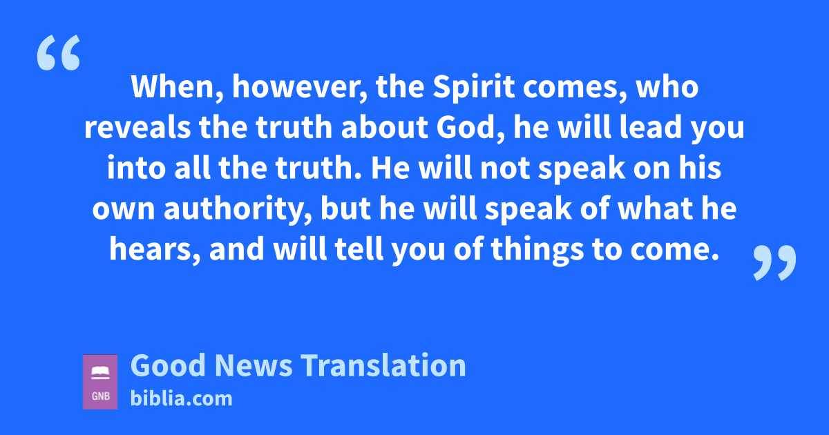 “I have much more to tell you, but now it would be too much for you to bear. 13When, however, the Spirit comes, who reveals the truth about God, he will lead you into all the truth. He will not speak on his own authority, but he will speak of what he hears, and will tell you of things to come. 14He will give me glory, because he will take what I say and tell it to you. 15All that my Father has is mine; that is why I said that the Spirit will take what I give him and tell it to you.