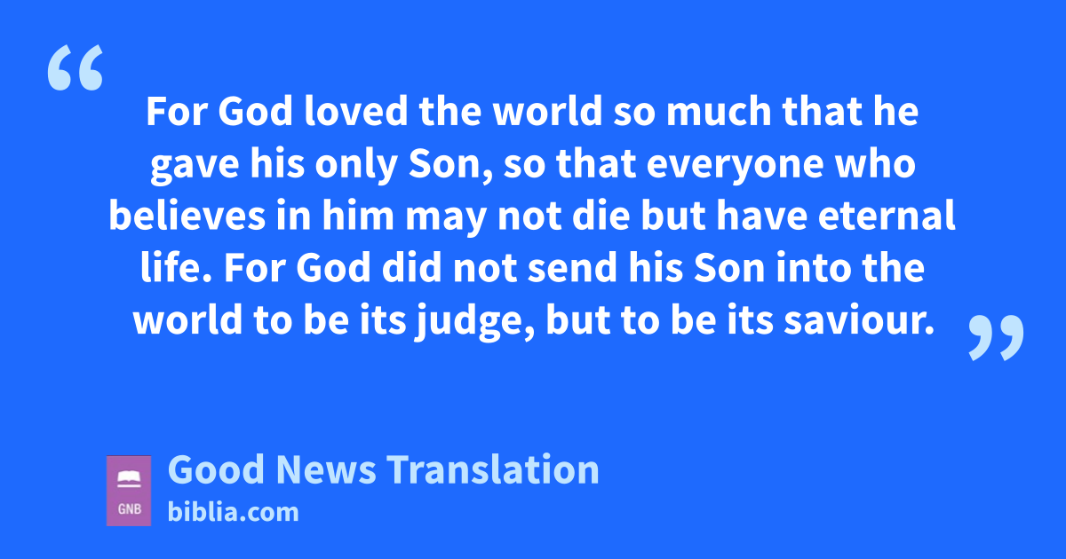 14 *As Moses lifted up the bronze snake on a pole in the desert, in the same way the Son of Man must be lifted up, 15so that everyone who believes in him may have eternal life. 16For God loved the world so much that he gave his only Son, so that everyone who believes in him may not die but have eternal life. 17For God did not send his Son into the world to be its judge, but to be its saviour.