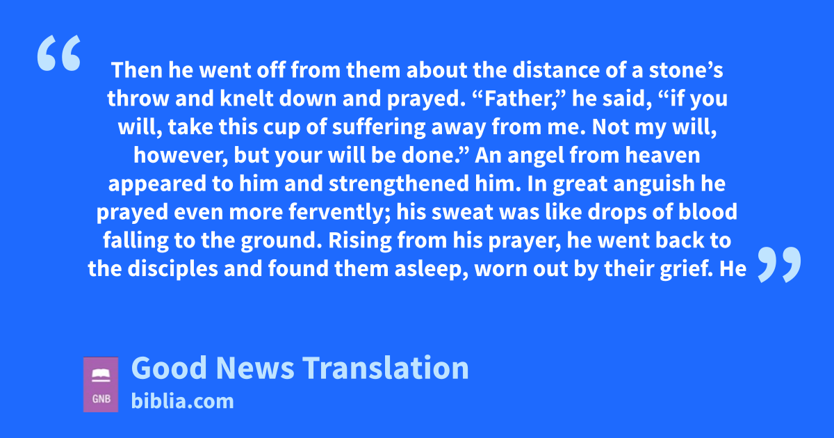 41 Then he went off from them about the distance of a stone’s throw and knelt down and prayed. 42“Father,” he said, “if you will, take this cup of suffering away from me. Not my will, however, but your will be done.” 43An angel from heaven appeared to him and strengthened him. 44In great anguish he prayed even more fervently; his sweat was like drops of blood falling to the ground.b