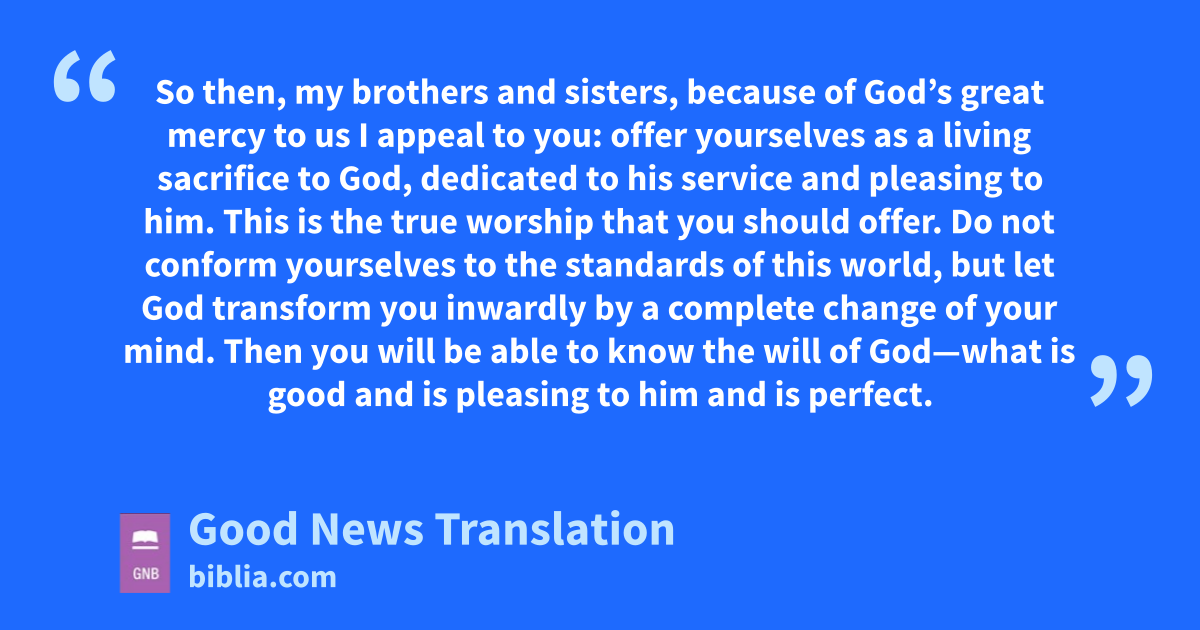 12 So then, my brothers and sisters, because of God’s great mercy to us I appeal to you: offer yourselves as a living sacrifice to God, dedicated to his service and pleasing to him. This is the true worship that you should offer. 2Do not conform yourselves to the standards of this world, but let God transform you inwardly by a complete change of your mind. Then you will be able to know the will of God—what is good and is pleasing to him and is perfect.