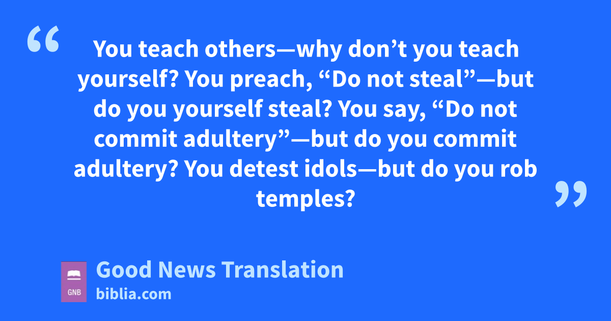 17 What about you? You call yourself a Jew; you depend on the Law and boast about God; 18you know what God wants you to do, and you have learnt from the Law to choose what is right; 19you are sure that you are a guide for the blind, a light for those who are in darkness, 20an instructor for the foolish, and a teacher for the ignorant. You are certain that in the Law you have the full content of knowledge and of truth. 21You teach others—why don’t you teach yourself? You preach, “Do not steal”—but do you yourself steal? 22You say, “Do not commit adultery”—but do you commit adultery? You detest idols—but do you rob temples? 23You boast about having God’s law—but do you bring shame on God by breaking his law? 24*The scripture says, “Because of you Jews, the Gentiles speak evil of God.”