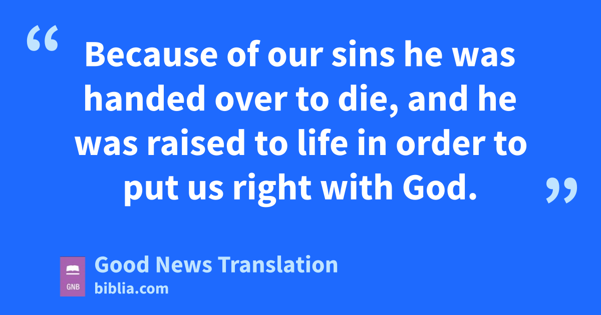 13 *When God promised Abraham and his descendants that the world would belong to him, he did so, not because Abraham obeyed the Law, but because he believed and was accepted as righteous by God. 14*For if what God promises is to be given to those who obey the Law, then faith means nothing and God’s promise is worthless. 15The Law brings down God’s anger; but where there is no law, there is no disobeying of the law. 16*And so the promise was based on faith, in order that the promise should be guaranteed as God’s free gift to all of Abraham’s descendants—not just to those who obey the Law, but also to those who believe as Abraham did. For Abraham is the spiritual father of us all; 17*as the scripture says, “I have made you father of many nations.” So the promise is good in the sight of God, in whom Abraham believed—the God who brings the dead to life and whose command brings into being what did not exist. 18*Abraham believed and hoped, even when there was no reason for hoping, and so became “the father of many nations.” Just as the scripture says, “Your descendants will be as many as the stars.” 19*He was then almost one hundred years old; but his faith did not weaken when he thought of his body, which was already practically dead, or of the fact that Sarah could not have children. 20His faith did not leave him, and he did not doubt God’s promise; his faith filled him with power, and he gave praise to God. 21He was absolutely sure that God would be able to do what he had promised. 22That is why Abraham, through faith, “was accepted as righteous by God”. 23The words “he was accepted as righteous” were not written for him alone. 24They were written also for us who are to be accepted as righteous, who believe in him who raised Jesus our Lord from death. 25*Because of our sins he was handed over to die, and he was raised to life in order to put us right with God.