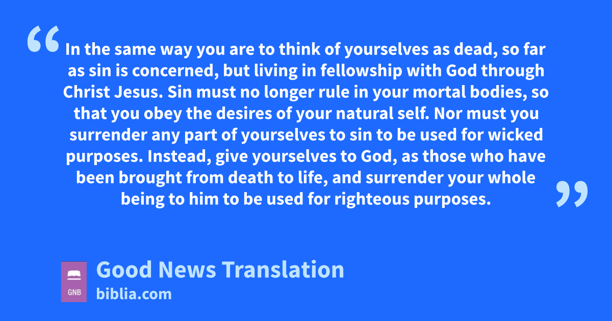 12 Sin must no longer rule in your mortal bodies, so that you obey the desires of your natural self. 13Nor must you surrender any part of yourselves to sin to be used for wicked purposes. Instead, give yourselves to God, as those who have been brought from death to life, and surrender your whole being to him to be used for righteous purposes. 14Sin must not be your master; for you do not live under law but under God’s grace.
