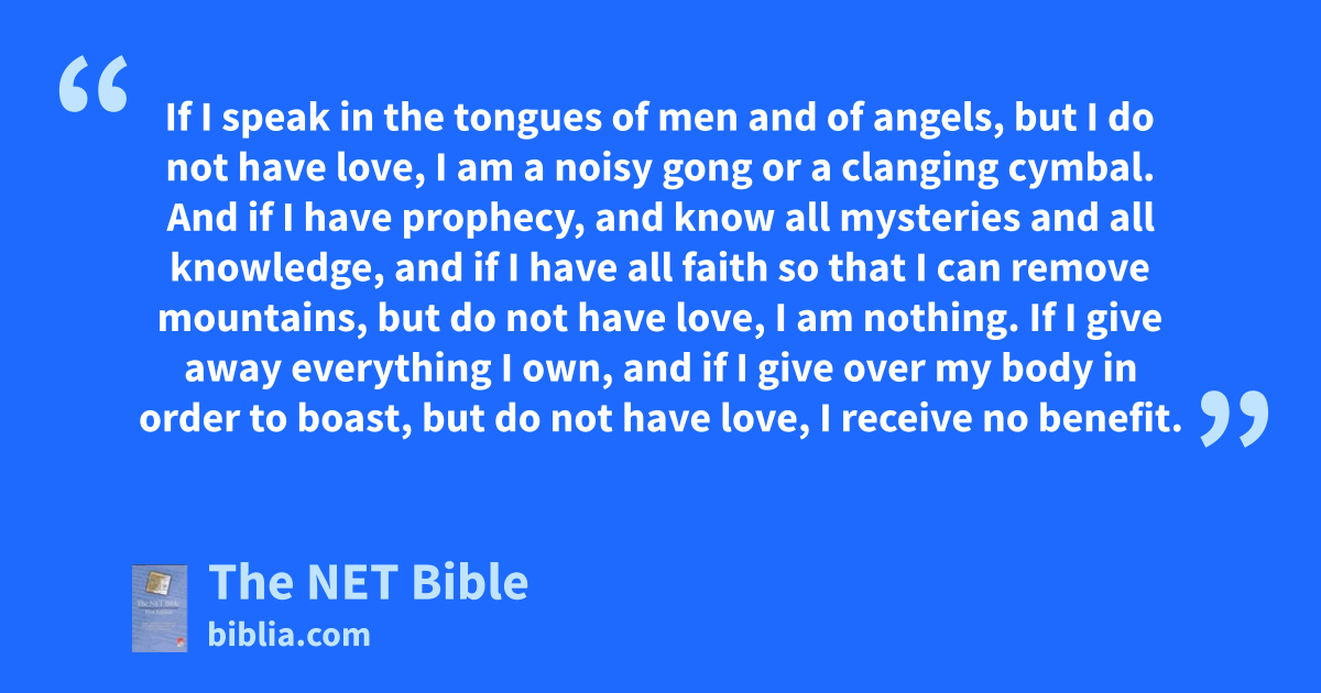 13:1 If I speak in the tongues of men and of angels, but I do not have love, I am a noisy gong or a clanging cymbal. 13:2 And if I have prophecy, and know all mysteries and all knowledge, and if I have all faith so that I can remove mountains, but do not have love, I am nothing. 13:3 If I give away everything I own, and if I give over my body in order to boast,1 but do not have love, I receive no benefit.