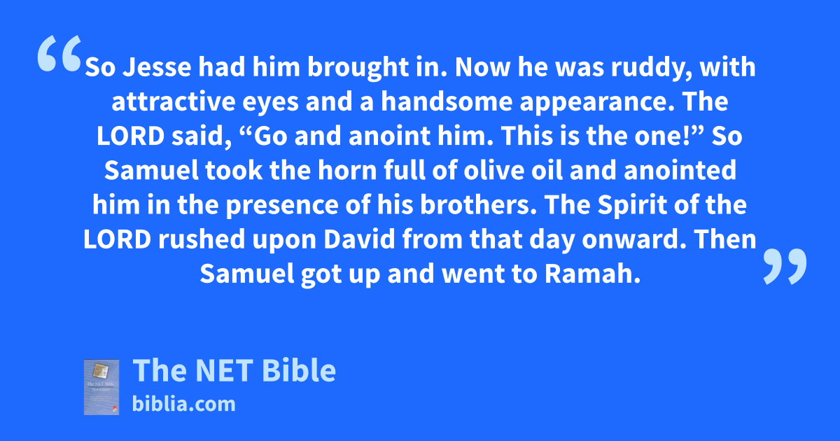 16:12 So Jesse had him brought in.21 Now he was ruddy, with attractive eyes and a handsome appearance. The Lord said, “Go and anoint him. This is the one!” 16:13 So Samuel took the horn full of olive oil and anointed him in the presence of his brothers. The Spirit of the Lord rushed upon David from that day onward. Then Samuel got up and went to Ramah.