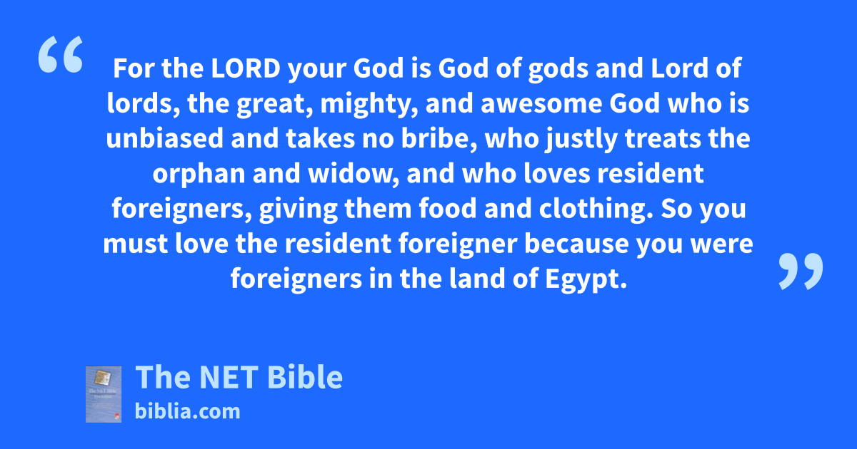 10:12 Now, Israel, what does the Lord your God require of you except to revere him,21 to obey all his commandments,22 to love him, to serve him23 with all your mind and being,24 10:13 and to keep the Lord’s commandments and statutes that I am giving25 you today for your own good? 10:14 The heavens—indeed the highest heavens—belong to the Lord your God, as does the earth and everything in it. 10:15 However, only to your ancestors did he26 show his loving favor,27 and he chose you, their descendants,28 from all peoples—as is apparent today. 10:16 Therefore, cleanse29 your heart and stop being so stubborn!30 10:17 For the Lord your God is God of gods and Lord of lords, the great, mighty, and awesome God who is unbiased and takes no bribe, 10:18 who justly treats31 the orphan and widow, and who loves resident foreigners, giving them food and clothing. 10:19 So you must love the resident foreigner because you were foreigners in the land of Egypt. 10:20 Revere the Lord your God, serve him, be loyal to him and take oaths only in his name. 10:21 He is the one you should praise;32 he is your God, the one who has done these great and awesome things for you that you have seen. 10:22 When your ancestors went down to Egypt, they numbered only seventy, but now the Lord your God has made you as numerous as the stars of the sky.33