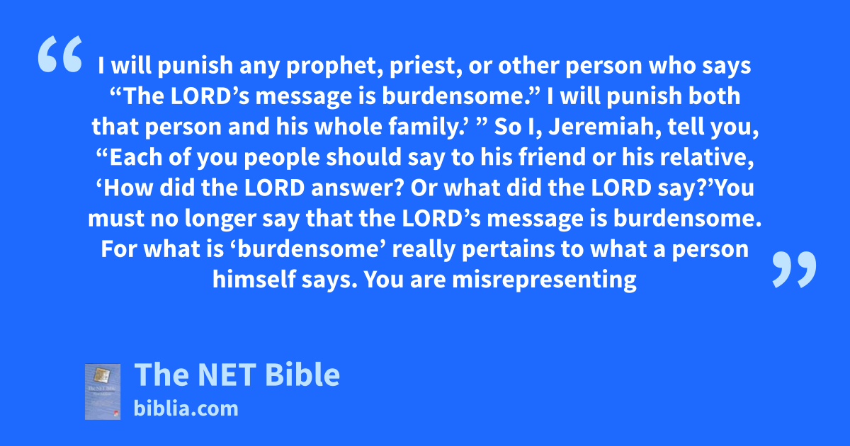 23:33 The Lord said to me, “Jeremiah,95 when one of these people, or a prophet, or a priest asks you, ‘What burdensome message96 do you have from the Lord?’ Tell them, ‘You are the burden,97 and I will cast you away.98 I, the Lord, affirm it!99 23:34 I will punish any prophet, priest, or other person who says “The Lord’s message is burdensome.”100 I will punish both that person and his whole family.’ ”101