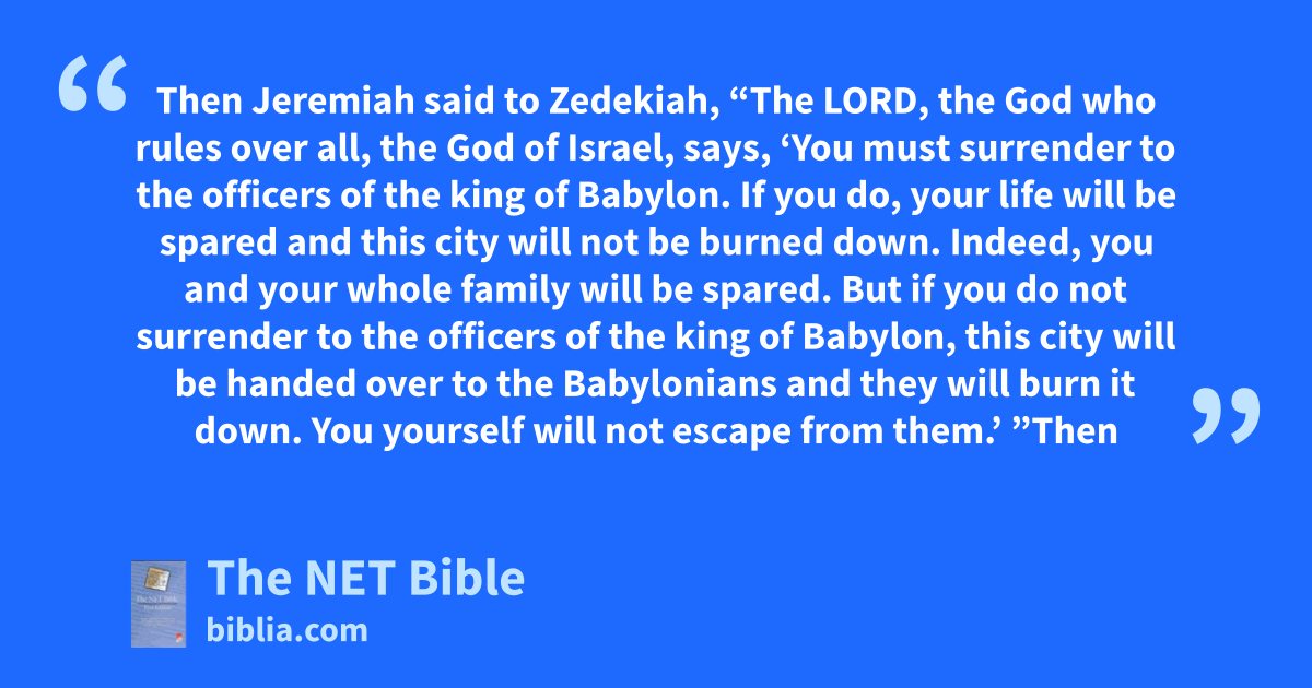 38:17 Then Jeremiah said to Zedekiah, “The Lord, the God who rules over all, the God of Israel,37 says, ‘You must surrender to the officers of the king of Babylon. If you do, your life will be spared38 and this city will not be burned down. Indeed, you and your whole family will be spared. 38:18 But if you do not surrender to the officers of the king of Babylon, this city will be handed over to the Babylonians39 and they will burn it down. You yourself will not escape from them.’ ”40 38:19 Then King Zedekiah said to Jeremiah, “I am afraid of the Judeans who have deserted to the Babylonians.41 The Babylonians might hand me over to them and they will torture me.”42 38:20 Then Jeremiah answered, “You will not be handed over to them. Please obey the Lord by doing what I have been telling you.43 Then all will go well with you and your life will be spared.44 38:21 But if you refuse to surrender, the Lord has shown me a vision of what will happen. Here is what I saw: 38:22 All the women who are left in the royal palace of Judah will be led out to the officers of the king of Babylon. They will taunt you saying,45