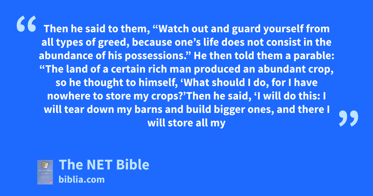 12:13 Then31 someone from the crowd said to him, “Teacher, tell32 my brother to divide the inheritance with me.” 12:14 But Jesus33 said to him, “Man,34 who made me a judge or arbitrator between you two?”35 12:15 Then36 he said to them, “Watch out and guard yourself from37 all types of greed,38 because one’s life does not consist in the abundance of his possessions.” 12:16 He then39 told them a parable:40 “The land of a certain rich man produced41 an abundant crop, 12:17 so42 he thought to himself,43 ‘What should I do, for I have nowhere to store my crops?’44 12:18 Then45 he said, ‘I46 will do this: I will tear down my barns and build bigger ones, and there I will store all my grain and my goods. 12:19 And I will say to myself,47 “You have plenty of goods stored up for many years; relax, eat, drink, celebrate!” ’ 12:20 But God said to him, ‘You fool! This very night your life48 will be demanded back from49 you, but who will get what you have prepared for yourself?’50 12:21 So it is with the one who stores up riches for himself,51 but is not rich toward God.”