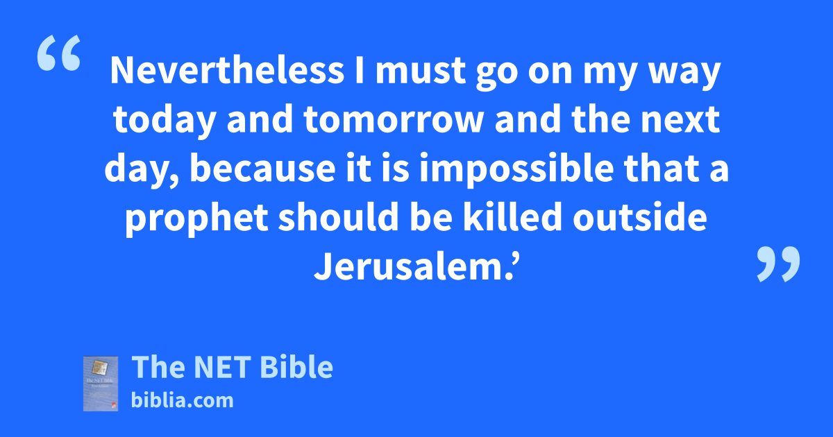 13:31 At that time,106 some Pharisees107 came up and said to Jesus,108 “Get away from here,109 because Herod110 wants to kill you.” 13:32 But111 he said to them, “Go112 and tell that fox,113 ‘Look, I am casting out demons and performing healings today and tomorrow, and on the third day114 I will complete my work.115 13:33 Nevertheless I must116 go on my way today and tomorrow and the next day, because it is impossible117 that a prophet should be killed118 outside Jerusalem.’119 13:34 O Jerusalem, Jerusalem,120 you who kill the prophets and stone those who are sent to you!121 How often I have longed122 to gather your children together as a hen gathers her chicks under her wings, but123 you would have none of it!124 13:35 Look, your house is forsaken!125 And I tell you, you will not see me until you say, ‘Blessed is the one who comes in the name of the Lord!’ ”126