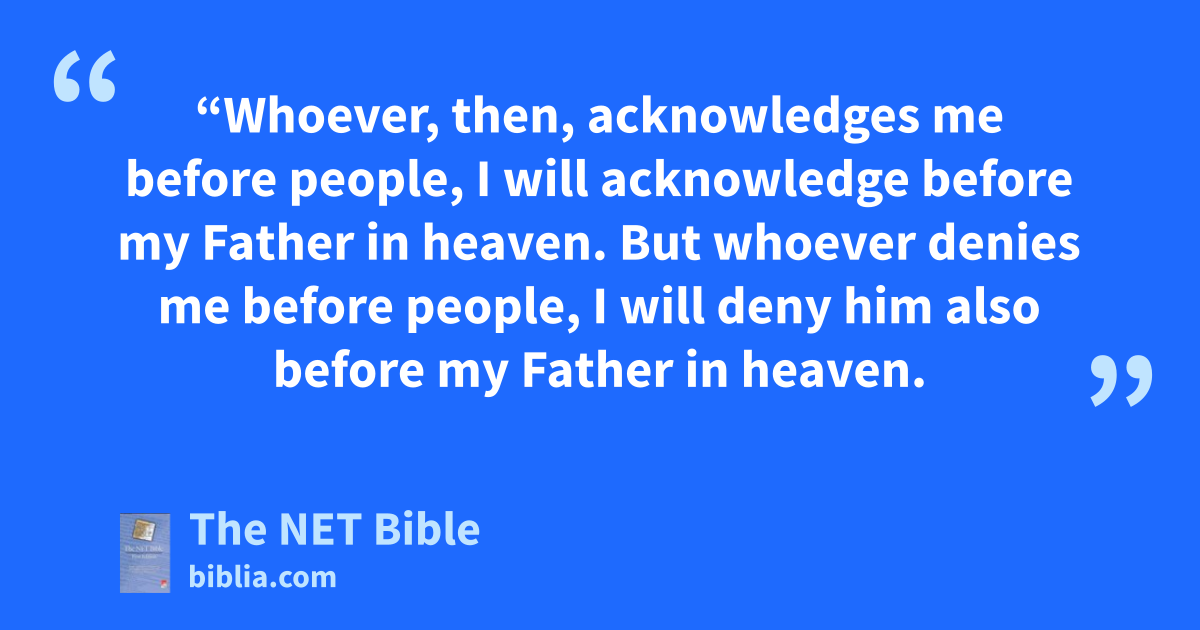 10:32 “Whoever, then, acknowledges58 me before people, I will acknowledge59 before my Father in heaven. 10:33 But whoever denies me before people, I will deny him also before my Father in heaven.