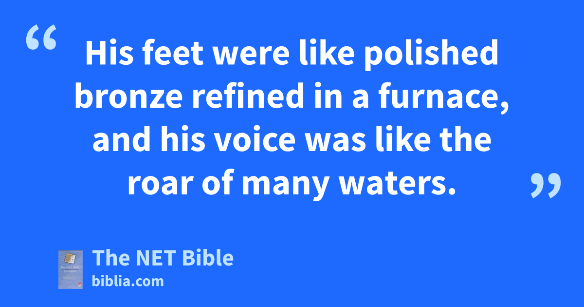 1:12 I43 turned to see whose voice was speaking to me,44 and when I did so,45 I saw seven golden lampstands, 1:13 and in the midst of the lampstands was one like a son of man.46 He was dressed in a robe extending down to his feet and he wore a wide golden belt47 around his chest. 1:14 His48 head and hair were as white as wool, even as white as snow,49 and his eyes were like a fiery50 flame. 1:15 His feet were like polished bronze51 refined52 in a furnace, and his voice was like the roar53 of many waters. 1:16 He held54 seven stars in his right hand, and a sharp double-edged sword extended out of his mouth. His55 face shone like the sun shining at full strength. 1:17 When56 I saw him I fell down at his feet as though I were dead, but57 he placed his right hand on me and said: “Do not be afraid! I am the first and the last, 1:18 and the one who lives! I58 was dead, but look, now I am alive—forever and ever—and I hold the keys of death and of Hades!59 1:19 Therefore write what you saw, what is, and what will be after these things.60 1:20 The mystery of the seven stars that you saw in my right hand and the seven golden lampstands is this:61 The seven stars are the angels62 of the seven churches and the seven lampstands are the seven churches.
