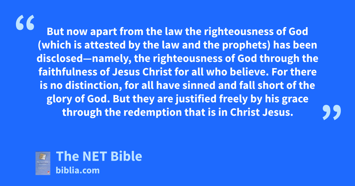 3:19 Now we know that whatever the law says, it says to those who are under22 the law, so that every mouth may be silenced and the whole world may be held accountable to God. 3:20 For no one is declared righteous before him23 by the works of the law,24 for through the law comes25 the knowledge of sin. 3:21 But now26 apart from the law the righteousness of God (which is attested by the law and the prophets)27 has been disclosed—3:22 namely, the righteousness of God through the faithfulness of Jesus Christ28 for all who believe. For there is no distinction, 3:23 for all have sinned and fall short of the glory of God. 3:24 But they are justified29 freely by his grace through the redemption that is in Christ Jesus. 3:25 God publicly displayed30 him31 at his death32 as the mercy seat33 accessible through faith.34 This was to demonstrate35 his righteousness, because God in his forbearance had passed over the sins previously committed.36 3:26 This was37 also to demonstrate38 his righteousness in the present time, so that he would be just39 and the justifier of the one who lives because of Jesus’ faithfulness.40