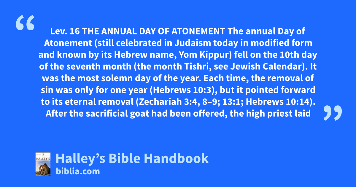 Lev. 16 THE ANNUAL DAY OF ATONEMENT The annual Day of Atonement (still celebrated in Judaism today in modified form and known by its Hebrew name, Yom Kippur) fell on the 10th day of the seventh month (the month Tishri, see Jewish Calendar). It was the most solemn day of the year. Each time, the removal of sin was only for one year (Hebrews 10:3), but it pointed forward to its eternal removal (Zechariah 3:4, 8–9; 13:1; Hebrews 10:14). After the sacrificial goat had been offered, the high priest laid