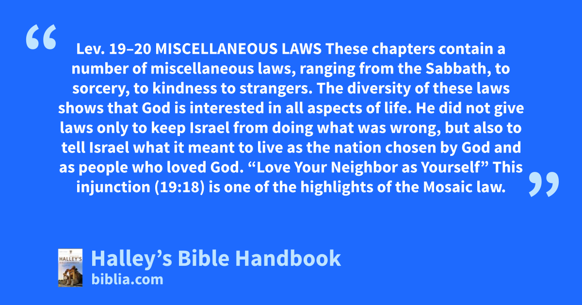 Lev. 19–20 MISCELLANEOUS LAWS These chapters contain a number of miscellaneous laws, ranging from the Sabbath, to sorcery, to kindness to strangers. The diversity of these laws shows that God is interested in all aspects of life. He did not give laws only to keep Israel from doing what was wrong, but also to tell Israel what it meant to live as the nation chosen by God and as people who loved God. “Love Your Neighbor as Yourself” This injunction (19:18) is one of the highlights of the Mosaic law.