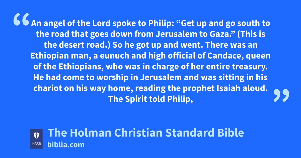 26 An angel of the Lord spoke to Philip: “Get up and go south to the road that goes down from Jerusalem to Gaza.” (This is the desert road.) k l 27 So he got up and went. There was an Ethiopian man, a eunuch m and high official of Candace, queen of the Ethiopians, n who was in charge of her entire treasury. He had come to worship in Jerusalem o 28 and was sitting in his chariot on his way home, reading the prophet Isaiah aloud.