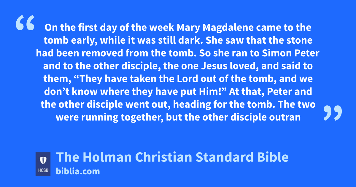 20 On m the first day of the week n * Mary Magdalene o came to the tomb p early, while it was still dark. She saw that the stone q had been removed r from the tomb. 2 So she ran to Simon Peter s and to the other disciple, the one Jesus loved, and said to them, “They have taken the Lord out of the tomb, t and we don’t know where they have put Him!”