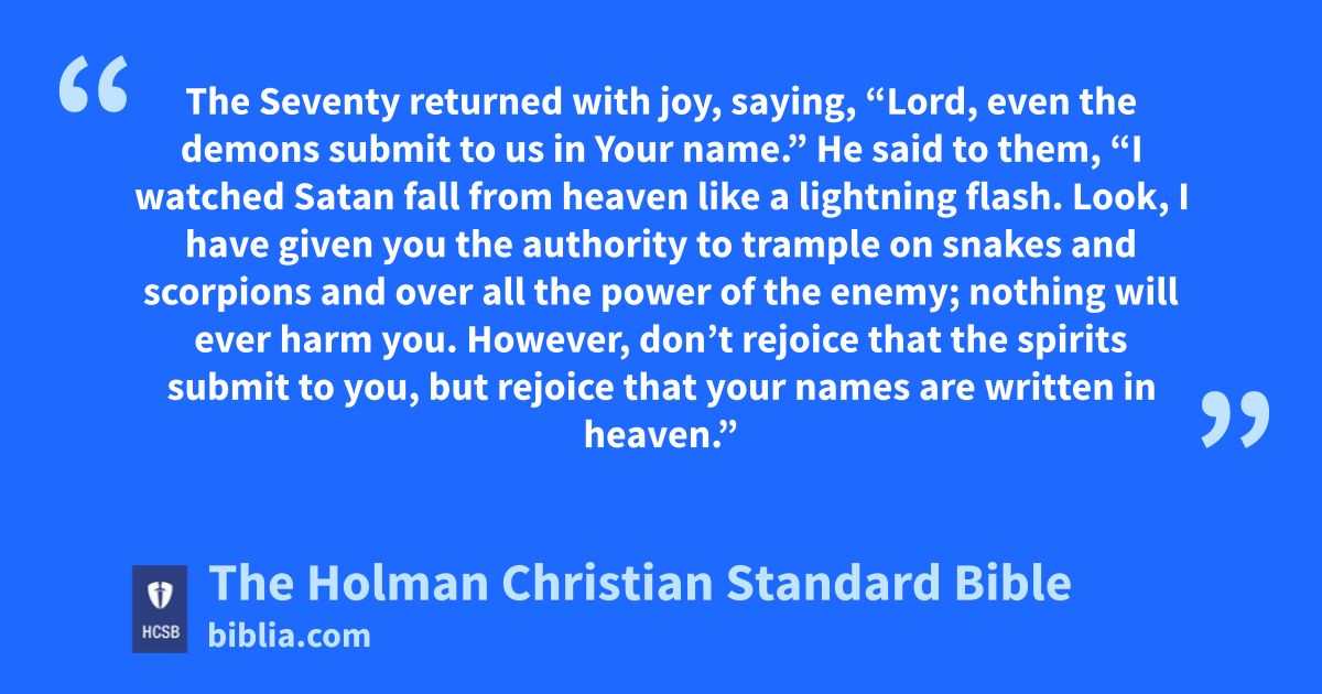 18 He said to them, “I watched Satan i fall from heaven like a lightning flash. j 19 Look, I have given you the authority k to trample l on snakes m and scorpions n and over all the power of the enemy; o nothing will ever harm you. p 20 However, don’t rejoice that q the spirits r submit to you, s but rejoice that your names are written t in heaven.”