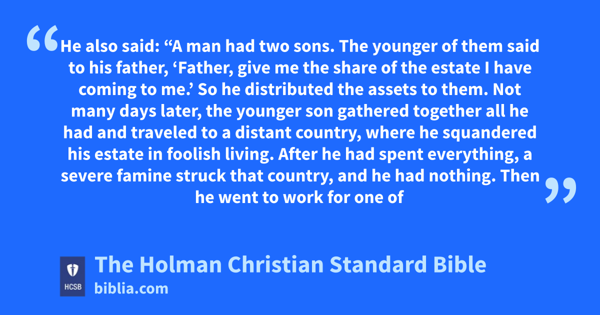11 He also said: “A man had two sons. 12 The younger of them said to his father, ‘Father, give me the share of the estate I have coming to me.’ So he distributed the assets s to them. 13 Not many days later, the younger son gathered together all he had and traveled to a distant country, where he squandered t his estate in foolish living. u 14 After he had spent everything, a severe famine struck that country, and he had nothing. v 15 Then he went to work for w one of the citizens of that country, who sent him into his fields to feed pigs. x 16 He longed to eat his fill from y the carob pods z the pigs were eating, but no one would give him any. 17 When he came to his senses, a he said, ‘How many of my father’s hired hands have more than enough food, and here I am dying of hunger! b 18 I’ll get up, go to my father, and say to him, Father, I have sinned c against heaven d and in your sight. 19 I’m no longer worthy e to be called your son. Make me like one of your hired hands.’ 20 So he got up and went to his father. But while the son was still a long way off, his father saw him and was filled with compassion. f He ran, threw his arms around his neck, g and kissed h him. 21 The son said to him, ‘Father, I have sinned against heaven and in your sight. I’m no longer worthy to be called your son.’