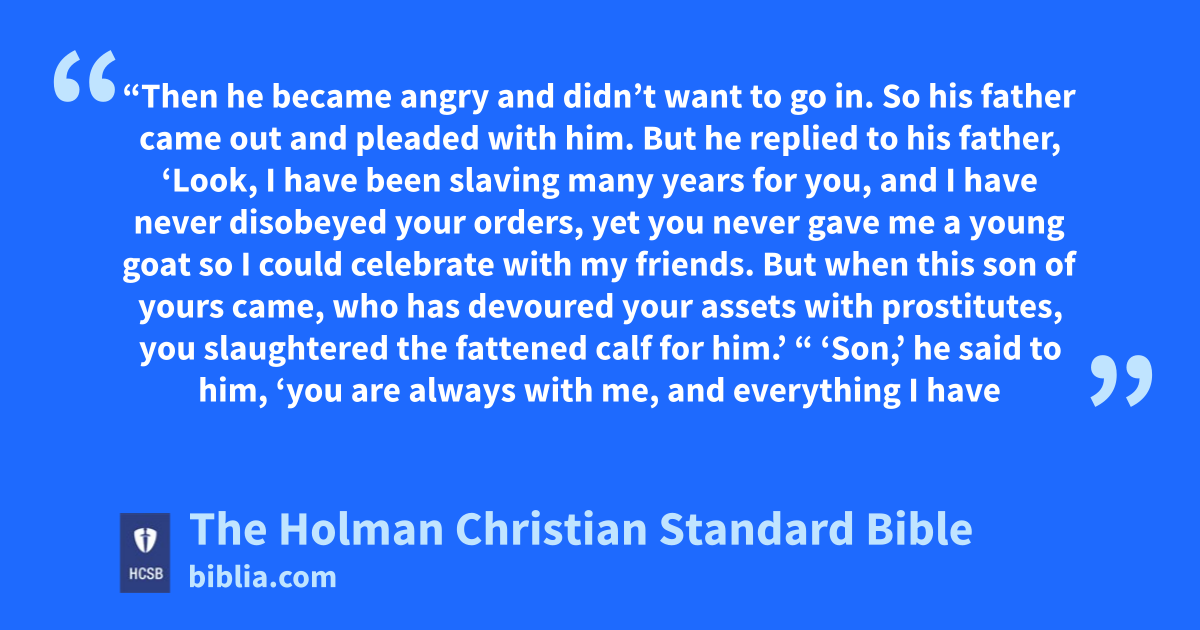 28 “Then he became angry and didn’t want to go in. So his father came out and pleaded with him. 29 But he replied to his father, ‘Look, I have been slaving many years for you, and I have never disobeyed your orders, yet you never gave me a young goat so I could celebrate with my friends. 30 But when this son of yours came, who has devoured your assets p with prostitutes, q you slaughtered the fattened calf for him.’