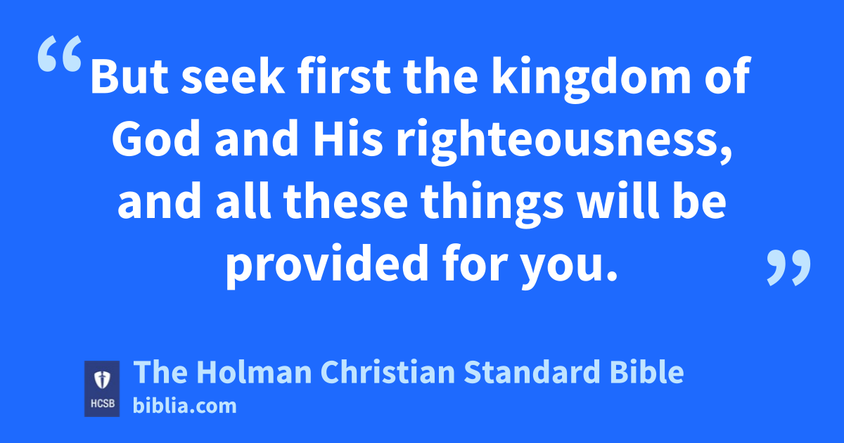25 “This is why I tell you: p Don’t worry about your life, what you will eat or what you will drink; or about your body, what you will wear. Isn’t life more than food and the body more than clothing? q 26 Look at the birds of the sky: They don’t sow or reap or gather into barns, yet your heavenly Father feeds them. Aren’t you worth more than they? r 27 Can any of you add a single * cubit to his height s by worrying? 28 And why do you worry about clothes? Learn how the wildflowers of the field grow: they don’t labor or spin thread. 29 Yet I tell you that not even Solomon in all his splendor was adorned like one of these! 30 If that’s how God clothes the grass of the field, which is here today and thrown into the furnace tomorrow, won’t He do much more for you—you of little faith? t 31 So don’t worry, saying, ‘What will we eat?’ or ‘What will we drink?’ or ‘What will we wear?’ 32 For the idolaters u eagerly seek all these things, and your heavenly Father knows that you need them. 33 But seek first the kingdom of God v w and His righteousness, x and all these things will be provided for you. y 34 Therefore don’t worry about tomorrow, because tomorrow will worry about itself. Each day has enough trouble z of its own.