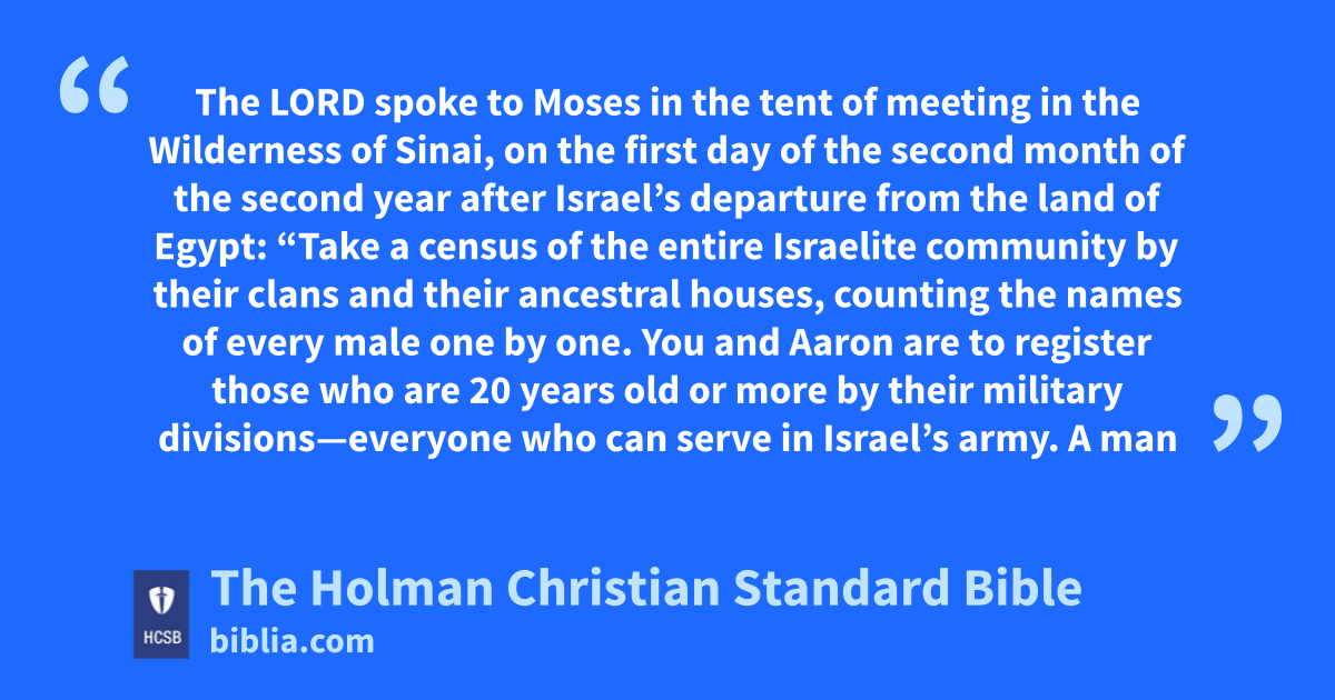 1 The Lord spoke to Moses in the tent of meeting a in the Wilderness of Sinai, b on the first day of the second month of the second year c after Israel’s departure from the land of Egypt: 2 “Take a census d of the entire Israelite community by their clans and their ancestral houses, counting the names of every male one by one. 3 You and Aaron are to register those who are 20 years old or more by their military divisions—everyone who can serve in Israel’s army. e f 4 A man from each tribe is to be with you, each one the head of his ancestral house. g 5 These are the names of the men who are to assist you: