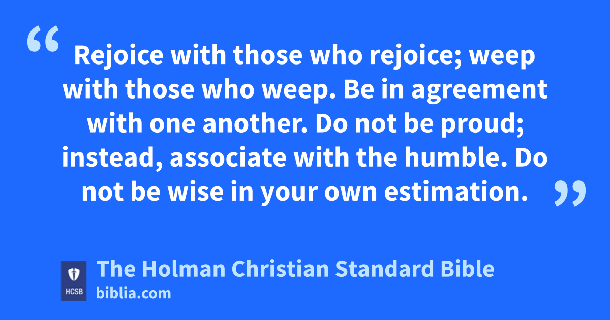 9 Love must be without hypocrisy. y Detest evil; z cling to what is good. 10 Show family affection to one another with brotherly love. a Outdo one another in showing honor. b 11 Do not lack diligence; be fervent in spirit; c serve the Lord. d 12 Rejoice in hope; e be patient in affliction; f be persistent in prayer. g 13 Share with the * saints in their needs; h pursue hospitality. i 14 Bless those who persecute you; j bless and do not curse. 15 Rejoice with those who rejoice; k weep with those who weep. 16 Be in agreement with one another. l Do not be proud; m instead, associate with the humble. Do not be wise in your own estimation. n 17 Do not repay anyone evil for evil. o Try to do what is honorable p in everyone’s eyes. 18 If possible, on your part, live at peace with everyone. q 19 Friends, do not avenge yourselves; instead, leave room for His r wrath. For it is written: Vengeance belongs to Me; I will repay, s t says the Lord. 20 But